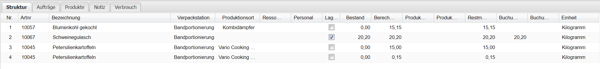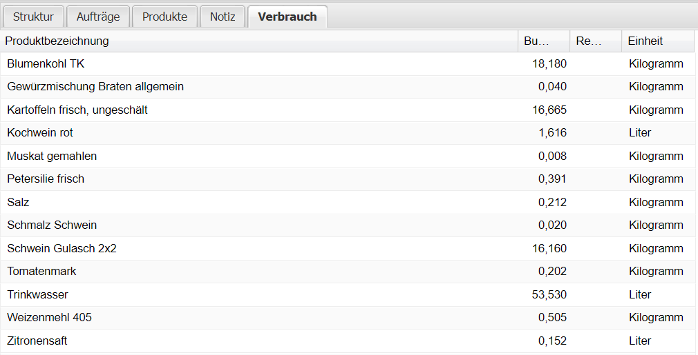 In dem Reiter Verbrauch sieht man welche Grundprodukte voraussichtlich benötigt werden.