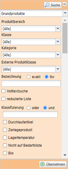 Produktklassifizierung, wie z.B. Hauptspeise, Sättigungsbeilage, Dessert, usw. Hier muss die entsprechende Produktklasse ausgewählt werden. Die Produkte können bei der Suche zu einem späteren Zeitpunkt über die Filterung auf Produktklasse schneller gefunden werden. Außerdem können dadurch verschiedene Auswertungen und Statistiken über die jeweilige Produktklasse erstellt werden.