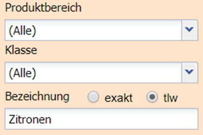 Hier kann über verschiedene Filtermöglichkeiten nach den Zutaten gesucht werden. In diesem Fall wurde über die Bezeichnung "Zitronen" nach der Zitrone als Zutat gesucht.