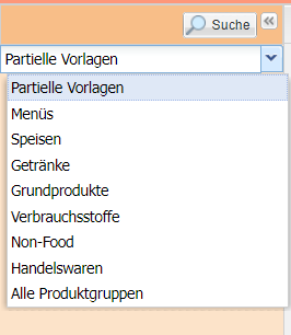 Üblicherweise werden Vorlagen mit Speisen oder Menüs befüllt. Zur weiteren Auswahl stehen noch "Wochenmenüplan Vorlagen", "Getränke", "Grundprodukte" und "Verbrauchsstoffe".