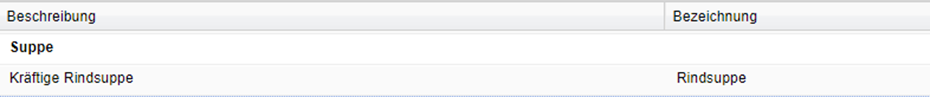 Hier können die Produkte nach diversen Suchkriterien gefiltert und gesucht werden. Hier wird nach der Bezeichnung "Rindsuppe" gesucht. Per Klick auf den Button "Suche" wird die Speise im links unteren Fenster angezeigt.